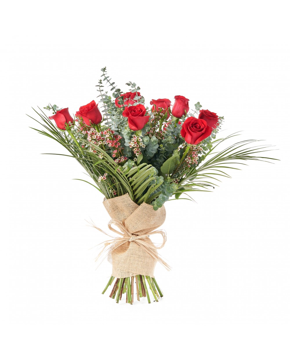 Ramo compuesto por 12 rosas rojas y diferentes verdes como relleno.