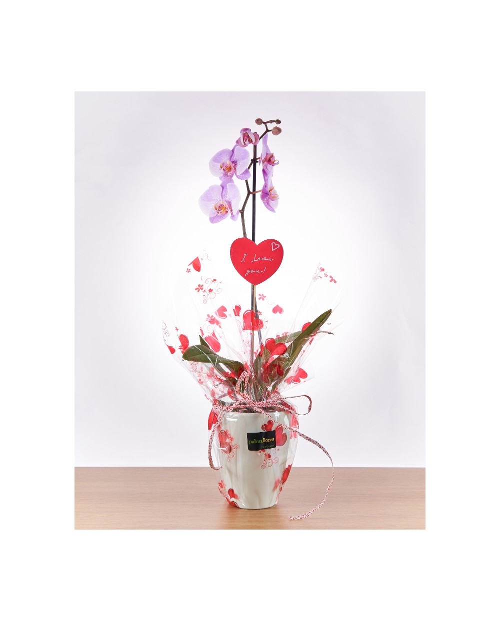 Orquidea phalaenopsis de 1 vara con macetero de cerámica, envuelta y decorada para enamorados
